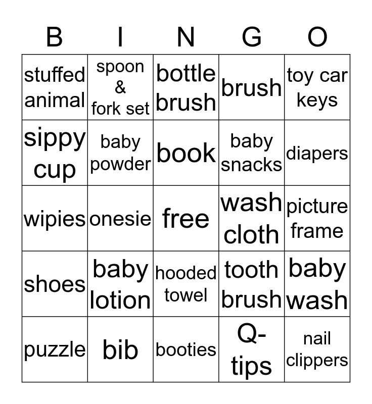 This bingo card has a free space and 24 words: baby lotion, bib, book, puzzle, toy car keys, stuffed animal, sippy cup, spoon & fork set, wash cloth, hooded towel, baby snacks, wipies, tooth brush, baby wash, baby powder, Q-tips, picture frame, bottle brush, diapers, onesie, nail clippers, shoes, brush and booties.