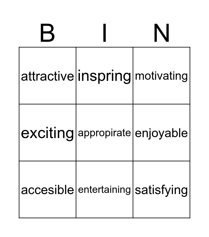 This bingo card has a free space and 8 words: enjoyable, motivating, inspring, accesible, attractive, satisfying, exciting and entertaining.
