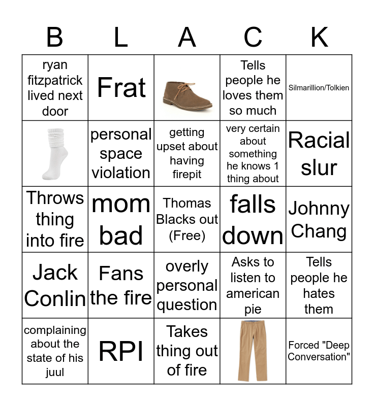 This bingo card has 3 images, a free space and 21 words: Fans the fire, RPI, getting upset about having firepit, complaining about the state of his juul, Silmarillion/Tolkien, ryan fitzpatrick lived next door, Frat, falls down, overly personal question, very certain about something he knows 1 thing about, Throws thing into fire, Asks to listen to american pie, Tells people he hates them, personal space violation, Johnny Chang, Racial slur, mom bad, Forced "Deep Conversation", Jack Conlin, Tells people he loves them so much and Takes thing out of fire.