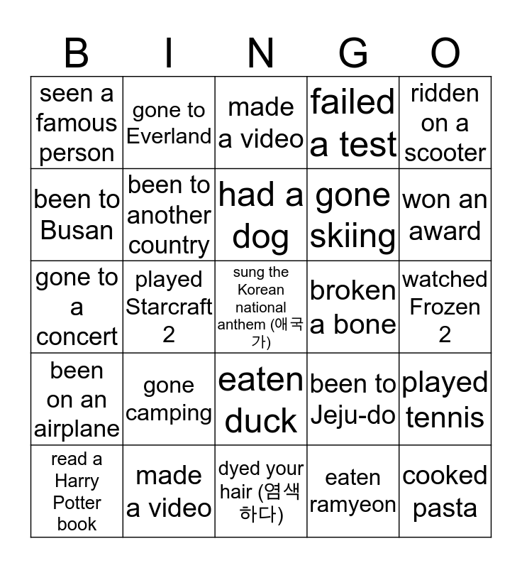 This bingo card has 25 words: gone camping, dyed your hair (염색하다), had a dog, read a Harry Potter book, ridden on a scooter, seen a famous person, been to Busan, gone to Everland, broken a bone, eaten duck, gone skiing, gone to a concert, been to Jeju-do, played tennis, been to another country, cooked pasta, watched Frozen 2, made a video, won an award, played Starcraft 2, sung the Korean national anthem (애국가), made a video, been on an airplane, failed a test and eaten ramyeon.