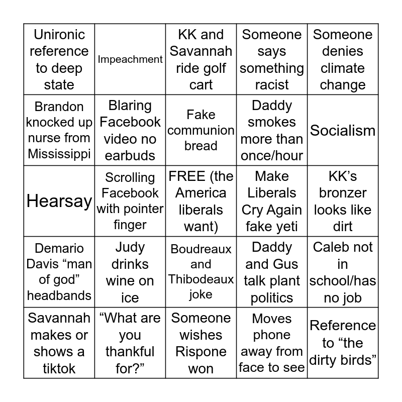 This bingo card has a free space and 24 words: Judy drinks wine on ice, “What are you thankful for?”, Fake communion bread, Savannah makes or shows a tiktok, Someone denies climate change, Unironic reference to deep state, Brandon knocked up nurse from Mississippi, Impeachment, Make Liberals Cry Again fake yeti, Boudreaux and Thibodeaux joke, Daddy smokes more than once/hour, Hearsay, Daddy and Gus talk plant politics, Caleb not in school/has no job, Blaring Facebook video no earbuds, Moves phone away from face to see, KK’s bronzer looks like dirt, KK and Savannah ride golf cart, Socialism, Scrolling Facebook with pointer finger, Reference to “the dirty birds”, Demario Davis “man of god” headbands, Someone says something racist and Someone wishes Rispone won.