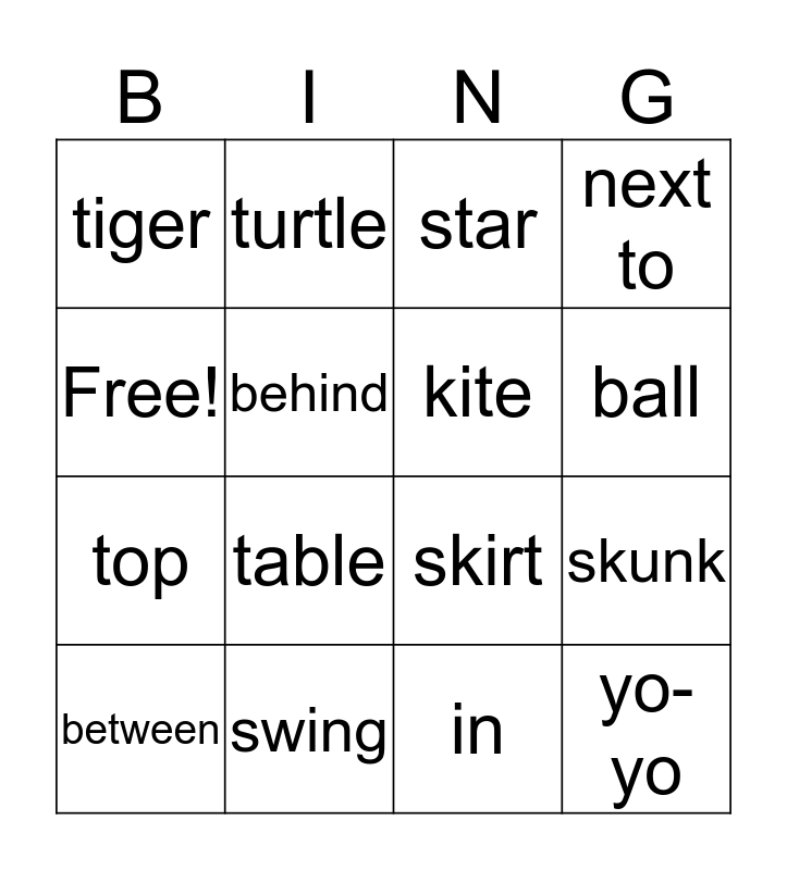 This bingo card has 16 words: swing, skunk, star, tiger, top, turtle, skirt, in, Free!, behind, between, next to, table, ball, kite and yo-yo.