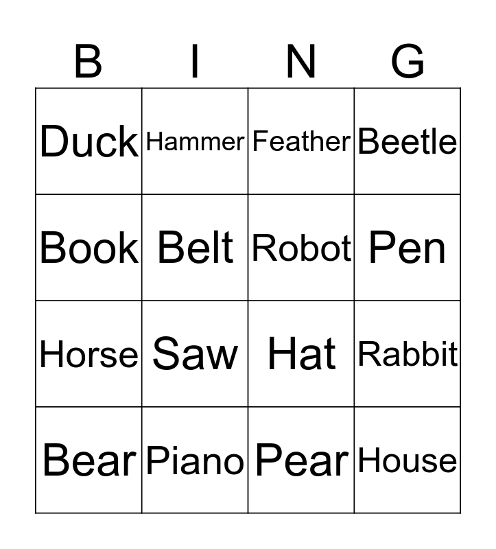 This bingo card has 20 words: Rabbit, Radio, Feather, Desk, Bear, Book, Piano, Duck, Horse, Hammer, Saw, Hat, Belt, House, Robot, Rainbow, Pen, Beetle, Pear and Pumpkin.