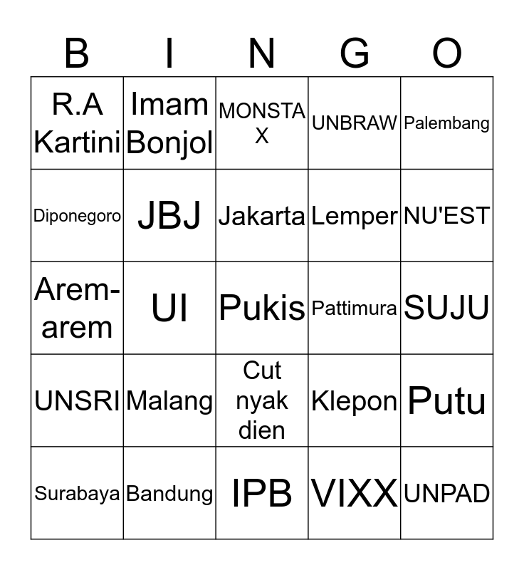 This bingo card has a free space and 24 words: Malang, Bandung, Jakarta, Surabaya, Palembang, R.A Kartini, Diponegoro, Imam Bonjol, Pattimura, Cut nyak dien, Lemper, Arem-arem, Klepon, Putu, JBJ, VIXX, SUJU, MONSTA X, NU'EST, UI, UNPAD, UNSRI, UNBRAW and IPB.