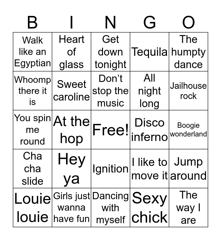 This bingo card has a free space and 100 words: Lets get it started, Come on Eileen, Boogie wonderland, Its my party, Celebration, Dj got us fallin in love, Brick house, Party in the usa, Cotton eye joe, Footloose, Old time rock and roll, Saturday night, Down, Girls just wanna have fun, Hotel room service, No diggity, All night long, Greased lighting, Play that funky music, Telephone, Summer of 69, All summer long, Ice ice baby, Thong song, Long train running, Disco inferno, The humpty dance, I like to move it, Baby got back, Jessie’s girl, At the hop, Walk like an Egyptian, Me myself and i, Jumpin jumpin destiny’s child, Sexy chick, Don’t stop the music, Jump around, Can I get a, Friends in low places, Electric boogie, Finally, Party like a rock star, You spin me round, On the floor, Jailhouse rock, Get down tonight, Stayin alive, Car wash, Gonna make you sweat, Dancing with myself, Low, Blister in the sun, Bust a move, Wild thing, Conga, 1 2 step, Funkytown, I love the nightlife, Brown eyed girl, Tequila, Lets dance, Save a horse ride a cowboy, Macarena, Ride wit me, Le freak, Boot scootin boogie, Red red wine, Chicken dance, Dance to the music, Wild thing, Wipe out, Hey ya, Ymca, Mony mony, Groove is in the heart, Tik tok, Rompe, Whoomp there it is, Just dance, Hot in here, Cmon ride the train, The way I are, 1999, Ignition, Yeah, Heart of glass, Dancing queen, Super freak, You gotta fight for your right to party, Cha cha slide, Pour some sugar on me, Im to sexy, Hips don’t lie, Louie louie, Sweet caroline, Family affair, I gotta feeling, Love shack, You shook me all night long and Get the party started.