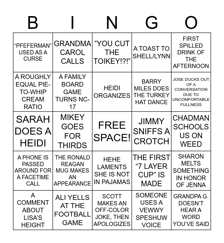 This bingo card has a free space and 25 words: THE RONALD REAGAN MUG MAKES AN APPEARANCE, SCOTT MAKES AN OFF-COLOR JOKE, THEN APOLOGIZES, HEIDI ORGANIZES, A COMMENT ABOUT LISA’S HEIGHT, FIRST SPILLED DRINK OF THE AFTERNOON, “PFEFERMAN” USED AS A CURSE, A ROUGHLY EQUAL PIE-TO-WHIP CREAM RATIO, GRANDMA CAROL CALLS, JIMMY SNIFFS A CROTCH, HEHE LAMENTS SHE IS NOT IN PAJAMAS, BARRY MILES DOES THE TURKEY HAT DANCE, SARAH DOES A HEIDI, THE FIRST “7 LAYER CUP” IS MADE, SHARON MELTS SOMETHING IN HONOR OF JENNA, A FAMILY BOARD GAME TURNS NC-17, PEEJ TALKS ABOUT HIS LATEST BREW, CHADMAN SCHOOLS US ON WEED, ”YOU CUT THE TOIKEY!?!”, JOSE DUCKS OUT OF A CONVERSATION DUE TO UNCOMFORTABLE FULLNESS, MIKEY GOES FOR THIRDS, GRANDPA G. DOESN’T HEAR A WORD YOU’VE SAID, ALI YELLS AT THE FOOTBALL GAME, A PHONE IS PASSED AROUND FOR A FACETIME CALL, A TOAST TO SHELL/LYNN and SOMEONE USES A VEWWY SPESHUW VOICE.