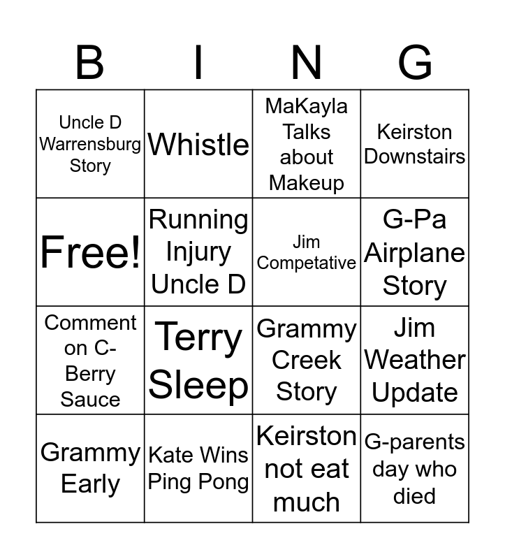 This bingo card has 16 words: Kate Wins Ping Pong, Jim Weather Update, MaKayla Talks about Makeup, Uncle D Warrensburg Story, Comment on C-Berry Sauce, Whistle, Grammy Creek Story, Keirston not eat much, Free!, Running Injury Uncle D, Grammy Early, Keirston Downstairs, Terry Sleep, G-Pa Airplane Story, Jim Competative and G-parents day who died.