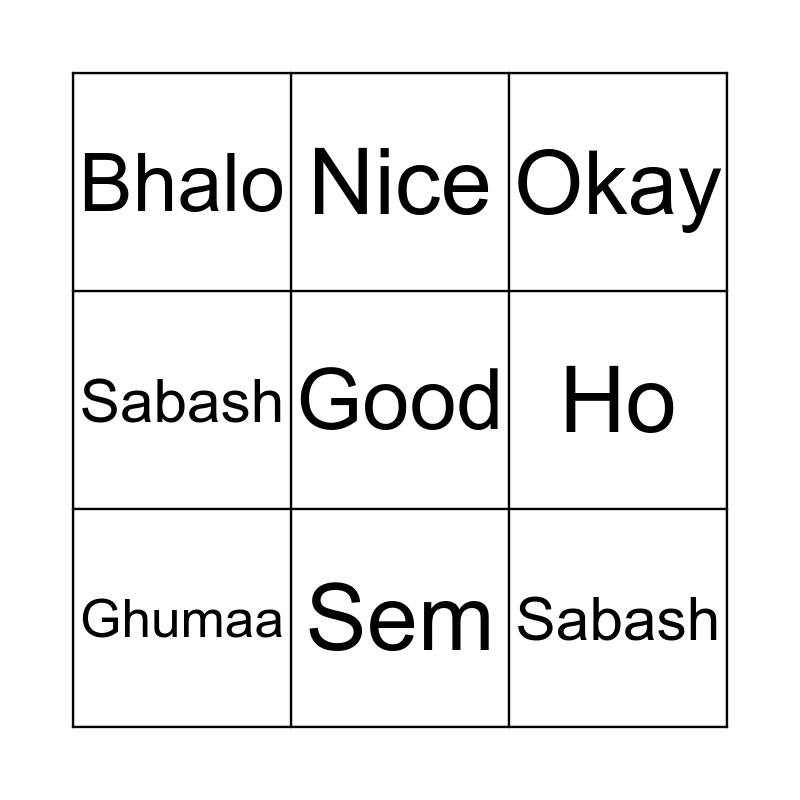 This bingo card has 10 words: Sem, Okay, Bhalo, Good, Sabash, Ghumaa, Nice, Accha, Ho and Sabash.