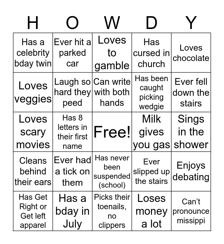 This bingo card has a free space and 24 words: Ever had a tick on them, Has a bday in July, Can write with both hands, Has Get Right or Get left apparel, Loves chocolate, Has a celebrity bday twin, Loves veggies, Ever hit a parked car, Milk gives you gas, Has never been suspended (school), Has been caught picking wedgie, Loves scary movies, Ever slipped up the stairs, Enjoys debating, Laugh so hard they peed, Loses money a lot, Sings in the shower, Loves to gamble, Ever fell down the stairs, Has 8 letters in their first name, Can’t pronounce missippi, Cleans behind their ears, Has cursed in church and Picks their toenails, no clippers.