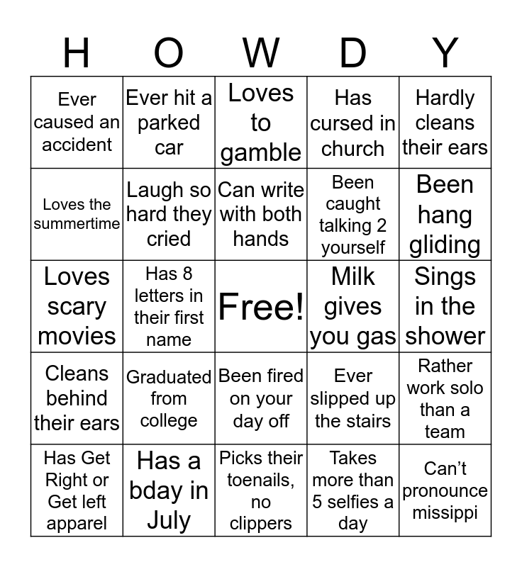 This bingo card has a free space and 24 words: Graduated from college, Has a bday in July, Can write with both hands, Has Get Right or Get left apparel, Hardly cleans their ears, Ever caused an accident, Loves the summertime, Ever hit a parked car, Milk gives you gas, Been fired on your day off, Been caught talking 2 yourself, Loves scary movies, Ever slipped up the stairs, Rather work solo than a team, Laugh so hard they cried, Takes more than 5 selfies a day, Sings in the shower, Loves to gamble, Been hang gliding, Has 8 letters in their first name, Can’t pronounce missippi, Cleans behind their ears, Has cursed in church and Picks their toenails, no clippers.