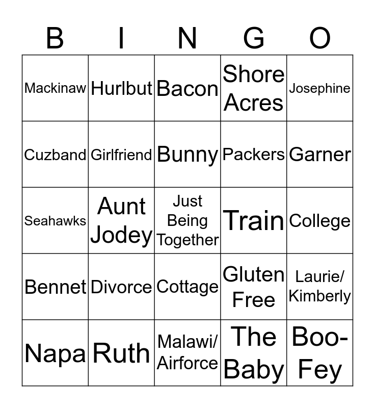 This bingo card has a free space and 26 words: Cottage, The Baby, Bunny, Ruth, Josephine, Mackinaw, Cuzband, Hurlbut, College, Gluten Free, Packers, Seahawks, Laurie/ Kimberly, Napa, Aunt Jodey, Ted, Shore Acres, Bennet, Bacon, Boo-Fey, Garner, Malawi/ Airforce, Train, Divorce, Girlfriend and Adult Crying.