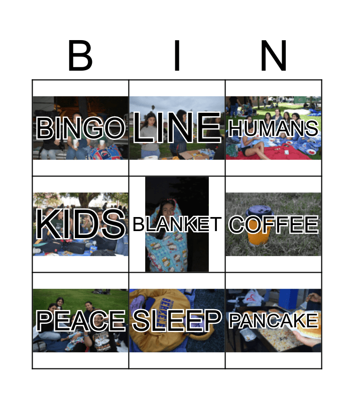 This bingo card has 17 images, a free space and 17 words: FRIENDS, PEOPLE, HUMANS, BINGO, BUDDIES, KIDS, NOODLES, PEACE, SLEEP, COFFEE, CHEESE, STAND, PANCAKE, LINE, PAPER, BAG and SPEAK.