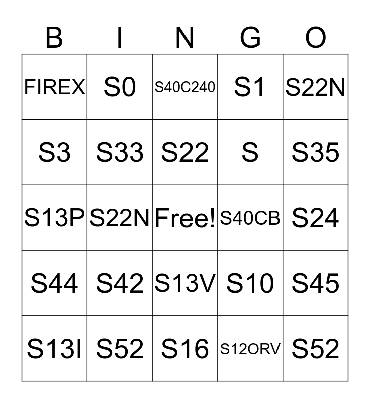 This bingo card has a free space and 35 words: Sig 20, S4, S2, S33, S13V, S1, S3, S40R, S22, S7, S13P, S22N, MEDX, S12P, FIREX, S40CB, S12ORV, S22N, S44, S52, S10, S13I, S45, S52, S40C240, S35, S34, S50, S, S24, S19, S16, S42, S0 and S12RD.