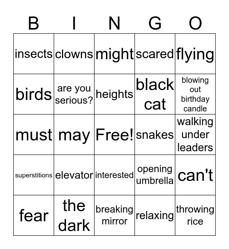 This bingo card has a free space and 24 words: elevator, the dark, heights, fear, flying, insects, birds, clowns, snakes, interested, black cat, must, opening umbrella, can't, are you serious?, relaxing, walking under leaders, might, blowing out birthday candle, may, throwing rice, superstitions, scared and breaking mirror.