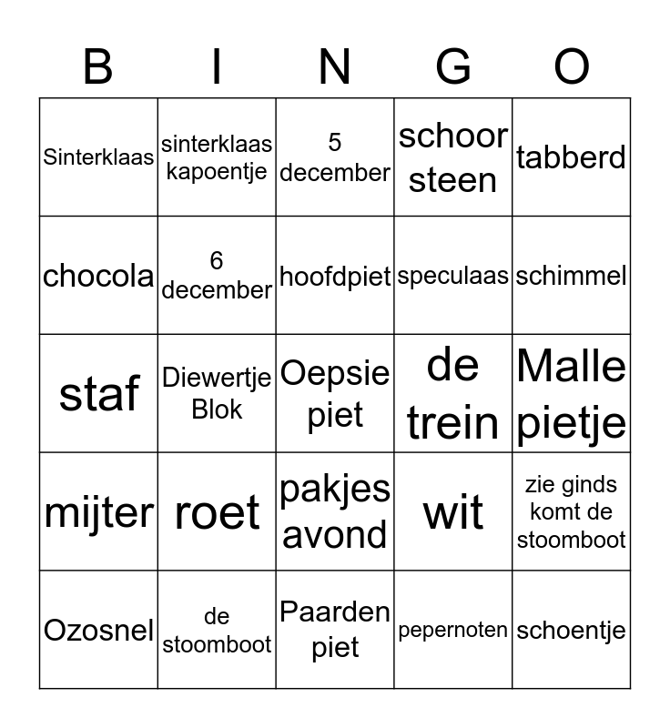 This bingo card has 29 words: Ozosnel, Amerigo, Diewertje Blok, schoentje, Sinterklaas, 5 december, 6 december, roet, de trein, de stoomboot, Malle pietje, Oepsie piet, Paarden piet, pepernoten, schimmel, cadeaus, pakjes avond, mijter, tabberd, staf, wit, verf, speculaas, chocola, schoor steen, sinterklaas kapoentje, zie ginds komt de stoomboot, hoofdpiet and rood.