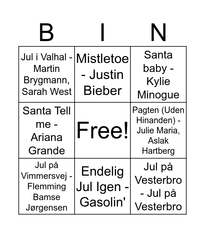 This bingo card has a free space and 31 words: All i want for Christmas is you - Mariah Carey, Jul i Angora - Drengene fra Angora, Jul på Vesterbro - Jul på Vesterbro, Rockin' Around the Christmas tree - Brenda Lee, Santa baby - Kylie Minogue, Santa Tell me - Ariana Grande, Mistletoe - Justin Bieber, Last Christmas - Wham!, Let Love Be Love - Juice, S.O.A.P mfl., My Only Wish (This Year) - Britney Spears, It's beginning to Look a Lot like Christmas - Michael Bublé, Jingle Bell Rock - Bobby Helms, I En Stjerneregn Af Sne - Mads Langer, Guld Jul - Gulddreng, Do They Know It's Christmas - Band Aid, Let It Snow! Let It Snow! Let It Snow! - Dean Martin, Finally It's Christmas Again - You Know Who, Christina, It's Hard To Be A Nissemand - De Nattergale, Happy Xmas (War is Over) - John Lennon, Yoko Ono, Jul-Det'Cool - Mc Einar, Shake Up Christmas - Train, Santa Claus Is Coming To Town - Jackson 5, En Rigtig Drengejul - Rasmus Bjerg, Citybois, Jul i Valhal - Martin Brygmann, Sarah West, Endelig Jul Igen - Gasolin', Pagten (Uden Hinanden) - Julie Maria, Aslak Hartberg, Jul på Vimmersvej - Flemming Bamse Jørgensen, Julesang - Gnags, Det'cember - Sys Bjerre, Cool Jul - Pyrus and Lokes Rapsody - Martin Brygmann.