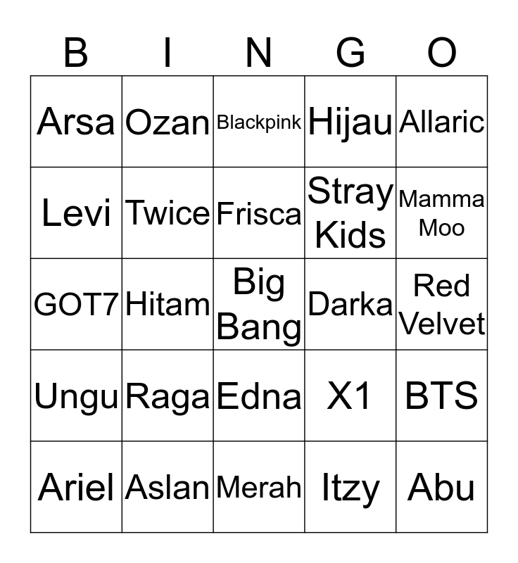 This bingo card has a free space and 24 words: Raga, Aslan, Frisca, Ariel, Allaric, Arsa, Levi, Ozan, Darka, Edna, Stray Kids, GOT7, X1, BTS, Twice, Itzy, Red Velvet, Blackpink, Mamma Moo, Hitam, Abu, Ungu, Hijau and Merah.