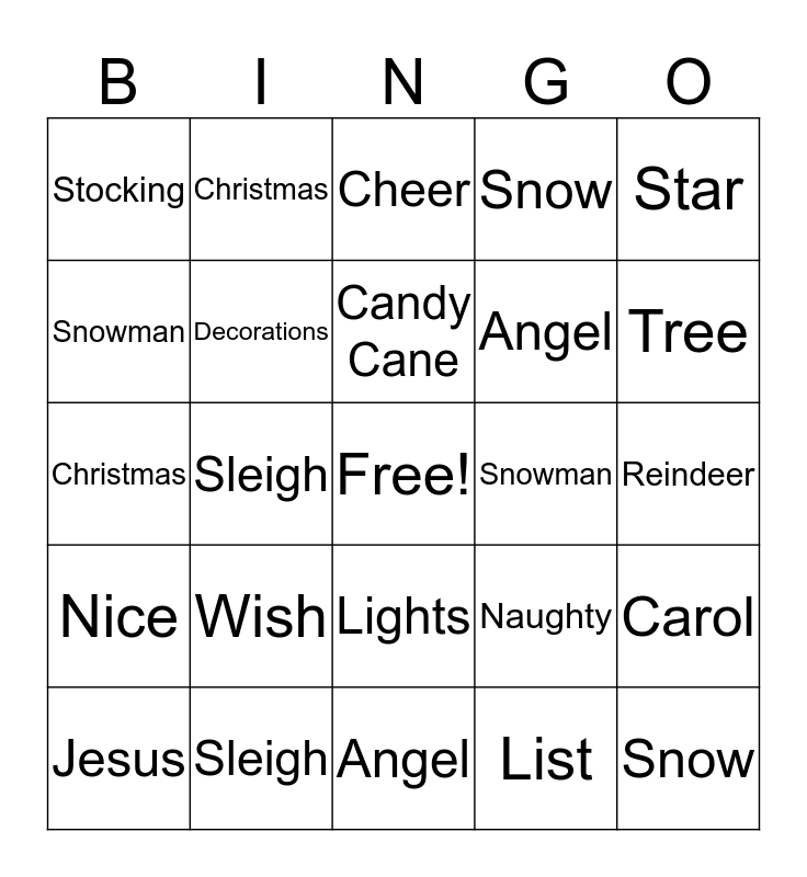 ⚠ This card has duplicate items: Elf (2), Snow (2), Presents (2), Santa (2), Jesus (2), Tree (2), Christmas (2), Toys (2), Candy Cane (2), Decorations (2), Lights (2), Rudolf (2), Reindeer (2), Star (2), Bells (2), Snowman (2), Sleigh (2), Stocking (2), Bethlehem (2), Wish (2), Angel (2), Naughty (2), Nice (2), List (2), Cold (2), North Pole (2), Winter (2), Carol (2), White (2), Cheer (2), Merry Christmas (2), Holly (2), Jolly (2)