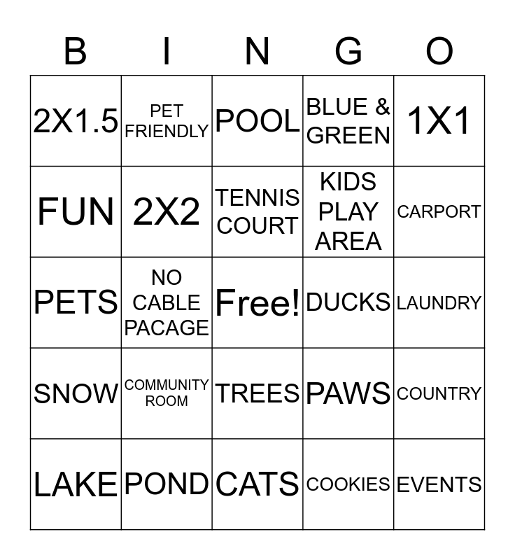 This bingo card has a free space and 29 words: GYM, POND, POOL, RESIDENT, 1X1, 2X1.5, 2X2, TENNIS COURT, DUCKS, COUNTRY, LAKE, NO CABLE PACAGE, COOKIES, EVENTS, PETS, DOGS, CATS, PAWS, CARPORT, SNOW, COMMUNITY ROOM, BASKETBALL COURT, KIDS PLAY AREA, LAUNDRY, FUN, PET FRIENDLY, TREES, BLUE & GREEN and GAZEBO.