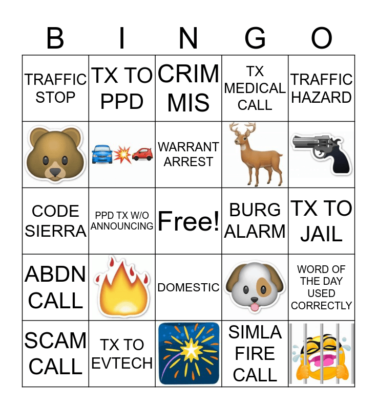 This bingo card has 11 images, a free space and 28 words: 911 PHN, MVA UNK INJ, SCAM CALL, DOMESTIC, WARRANT ARREST, SUICIDAL SUBJ, TRAFFIC HAZARD, ABDN CALL, PPD TX W/O ANNOUNCING, TX MEDICAL CALL, TX TO JAIL, BURG ALARM, FOUND PROPERTY, TRAFFIC STOP, CALL AT GROCERY STORE, MISSING CHILD, PARKING COMPLAINT, RP REFUSED, TX TO PPD, CALL TX TO WRONG AGENCY, UNK ADDRESS, CRIM MIS, TX TO EVTECH, SIMLA FIRE CALL, AGATE FIRE CALL, WORD OF THE DAY USED CORRECTLY, CODE SIERRA and EMERGENCY BUTTON PRESSED.