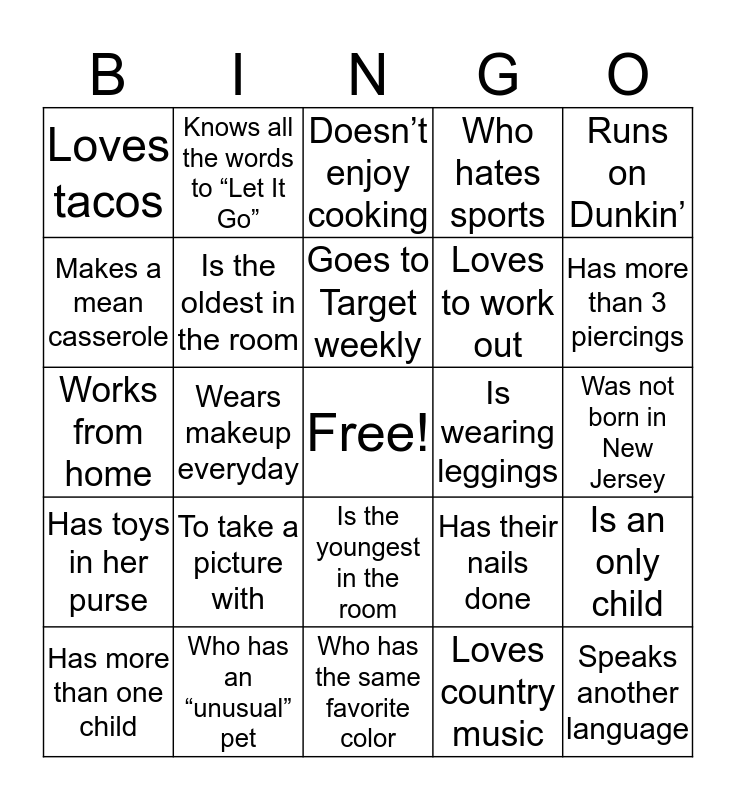 This bingo card has a free space and 24 words: To take a picture with, Who has an “unusual” pet, Goes to Target weekly, Has more than one child, Runs on Dunkin’, Loves tacos, Makes a mean casserole, Knows all the words to “Let It Go”, Is wearing leggings, Is the youngest in the room, Loves to work out, Works from home, Has their nails done, Is an only child, Is the oldest in the room, Loves country music, Was not born in New Jersey, Doesn’t enjoy cooking, Has more than 3 piercings, Wears makeup everyday, Speaks another language, Has toys in her purse, Who hates sports and Who has the same favorite color.