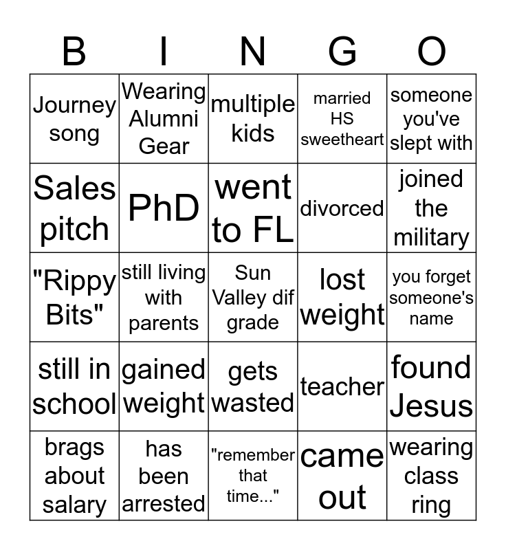 This bingo card has a free space and 24 words: gained weight, has been arrested, went to FL, brags about salary, someone you've slept with, Journey song, Sales pitch, Wearing Alumni Gear, lost weight, gets wasted, divorced, "Rippy Bits", teacher, found Jesus, PhD, came out, you forget someone's name, multiple kids, joined the military, still living with parents, wearing class ring, still in school, married HS sweetheart and "remember that time...".