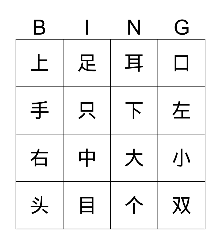 This bingo card has 16 words: 头, 目, 耳, 口, 手, 足, 大, 小, 上, 只, 个, 左, 右, 中, 下 and 双.