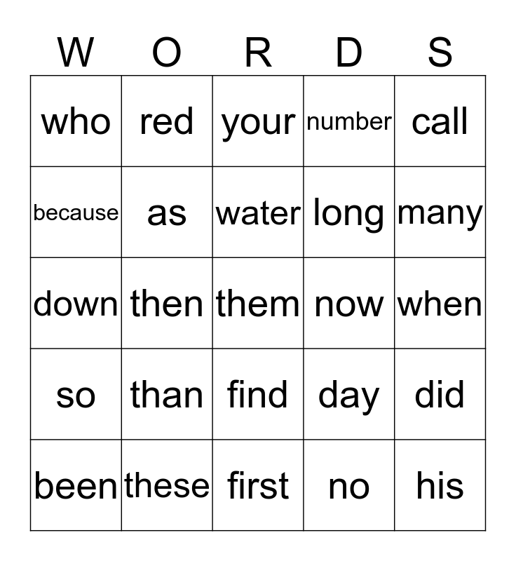 This bingo card has 25 words: than, first, water, been, call, who, because, red, now, find, long, down, day, did, as, his, when, your, many, then, them, these, so, number and no.