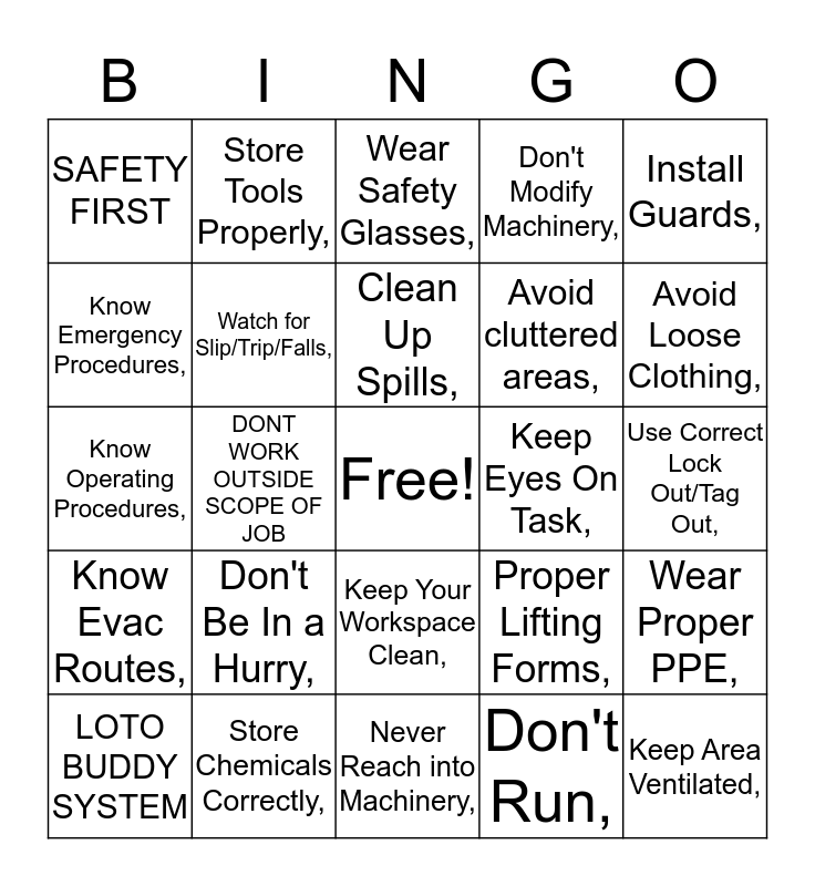 This bingo card has a free space and 29 words: LOTO BUDDY SYSTEM, NO RETRACTABLE LANYARDS, DONT WORK OUTSIDE SCOPE OF JOB, REPORT ALL INJURIES, SAFETY FIRST, Wear Safety Glasses,, Watch for Slip/Trip/Falls,, Don't Be In a Hurry,, Keep Eyes On Task,, Store Chemicals Correctly,, Use Correct Lock Out/Tag Out,, Keep Area Ventilated,, Never Reach into Machinery,, Don't Run,, Avoid Loose Clothing,, Follow Safety Procedures on JSA,, Keep Your Workspace Clean,, Know Evac Routes,, Install Guards,, Know Operating Procedures,, Proper Lifting Forms,, Don't Defeat Safety Systems,, Avoid cluttered areas,, Know Emergency Procedures,, Don't Modify Machinery,, Store Tools Properly,, Wear Proper PPE,, Clean Up Spills, and No Strings in Hoodies.