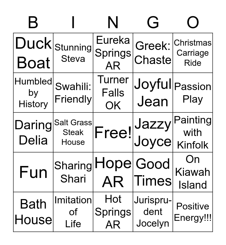 This bingo card has a free space and 45 words: Branson MO, Imitation of Life, Enjoy the Journey, Good Times, Patient Pat, Bath House, Swahili: Friendly, My Safe Place, Greek: Chaste, Positive Energy!!!, Duck Boat, Sisterhood, Jazzy Joyce, Painting with Kinfolk, Dynamic Diane, Sassy Sarita, Hotel Motel Holiday Inn, Joyful Jean, Limo Lights Ride, Daring Delia, Stunning Steva, Charleston SC, Jurispru- dent Jocelyn, Christmas Carriage Ride, Friendly, Sharp Shirley, Hot Springs AR, Who's rubbing my toes?, On Kiawah Island, Fun, Savanah GA, Turner Falls OK, Dallas Botanical Garden, Arabic: Loving Affection- ate, Warm & Welcoming, Sharing Shari, Hope AR, Hebrew: Grace Favor, Pretty in Plaid, Humbled by History, Salt Grass Steak House, Eureka Springs AR, House Seller Helen, Passion Play and Paddle Wheel Boat.