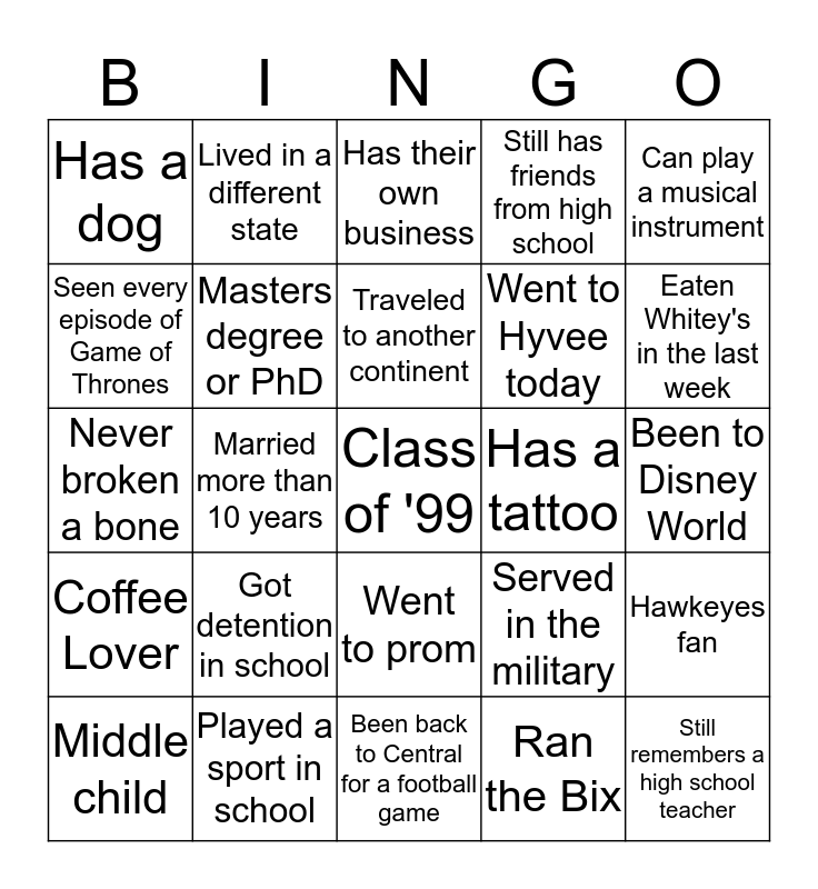 This bingo card has a free space and 33 words: Someone who went to the same college, Have the same number of kids, Married more than 10 years, Parents live in the same house as they did in '99, Coffee Lover, Masters degree or PhD, Can play a musical instrument, Middle child, Lived in a different state, Met a celebrity, Traveled to another continent, Has their own business, Loves snow, Still knows the DC fight song, Has a tattoo, Eaten Whitey's in the last week, Played a sport in school, Never broken a bone, Got detention in school, Served in the military, Went to prom, Enjoys cooking, Has a dog, Been to Disney World, Been back to Central for a football game, Still remembers a high school teacher, Still has friends from high school, Went to Hyvee today, Seen every episode of Game of Thrones, Hawkeyes fan, Had surgery, Ran the Bix and Been to Festival of Trees this year.