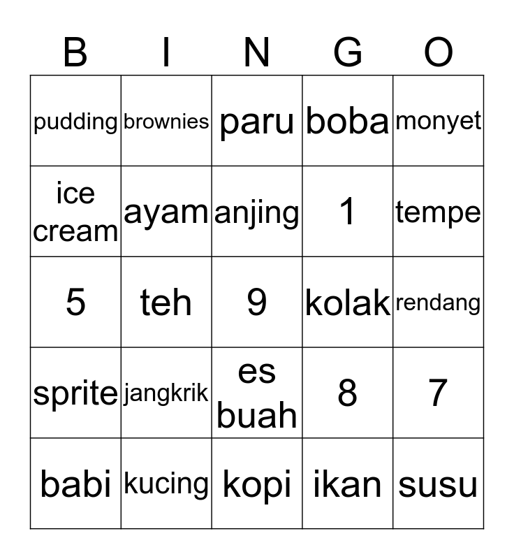 This bingo card has a free space and 24 words: jangkrik, kucing, anjing, babi, monyet, pudding, ice cream, brownies, kolak, es buah, 1, 5, 8, 7, ayam, ikan, rendang, paru, tempe, teh, susu, sprite, boba and kopi.