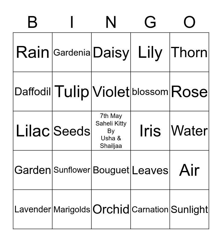 This bingo card has a free space and 28 words: Air, Bud, blossom, Carnation, Daffodil, Daisy, Gardenia, Garden, Iris, Lavender, Lilac, Lily, Marigolds, Orchid, Rose, Soil, Sunflower, Tulip, Violet, Bouguet, Rain, Soil, Sunlight, Seeds, Water, Leaves, Thorn and Petals.