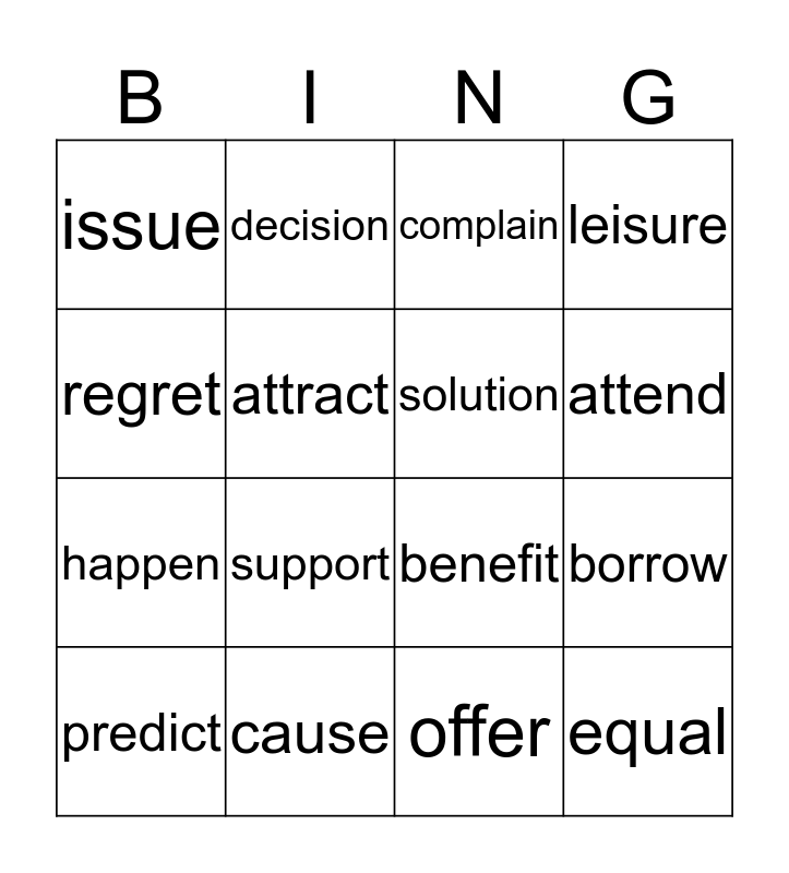 This bingo card has 16 words: cause, borrow, complain, issue, happen, decision, benefit, offer, regret, attract, predict, leisure, support, attend, solution and equal.
