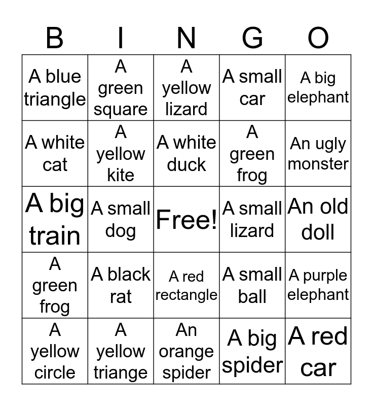 This bingo card has a free space and 24 words: A black rat, A yellow triange, A white duck, A yellow circle, A big elephant, A blue triangle, A white cat, A green square, A small lizard, A red rectangle, A green frog, A big train, A small ball, A purple elephant, A yellow kite, A big spider, An old doll, A yellow lizard, An ugly monster, A small dog, A red car, A green frog, A small car and An orange spider.