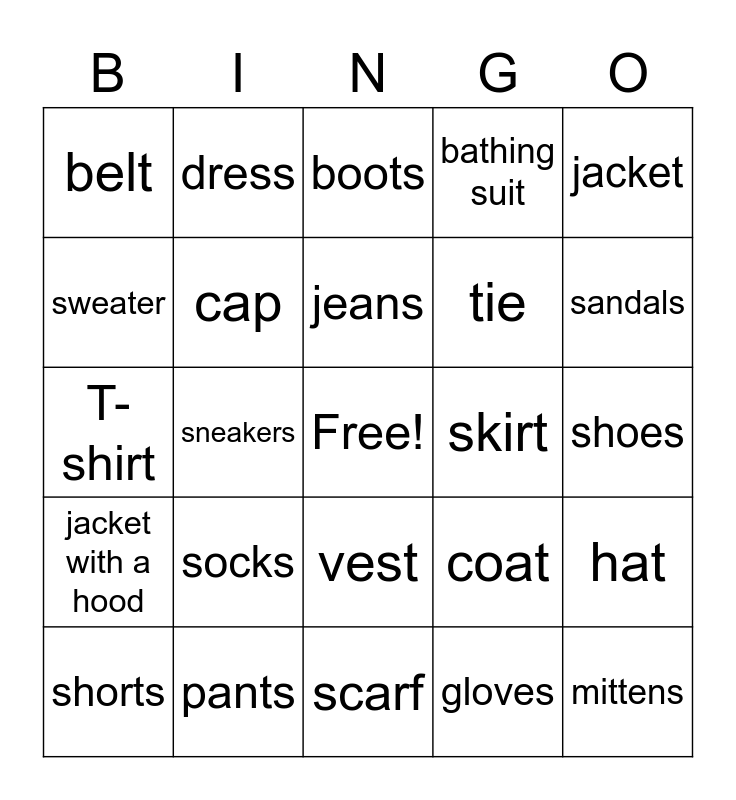 This bingo card has a free space and 24 words: socks, pants, jeans, shorts, jacket, belt, sweater, dress, skirt, vest, tie, T-shirt, coat, hat, cap, gloves, shoes, boots, sandals, sneakers, mittens, jacket with a hood, bathing suit and scarf.
