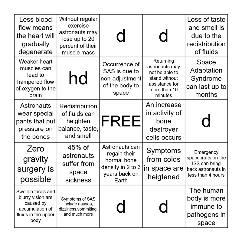 This bingo card has a free space and 24 words: 45% of astronauts suffer from space sickness, Symptoms of SAS include nausea, dizziness,vommiting, and much more, Occurrence of SAS is due to non-adjustment of the body to space, Swollen faces and blurry vision are caused by accumulation of fluids in the upper body, Loss of taste and smell is due to the redistribution of fluids, Less blood flow means the heart will gradually degenerate, Weaker heart muscles can lead to hampered flow of oxygen to the brain, Without regular exercise astronauts may lose up to 20 percent of their muscle mass, An increase in activity of bone destroyer cells occurs, Astronauts can regain their normal bone density in 2 to 3 years back on Earth, Returning astronauts may not be able to stand without assistance for more than 10 minutes, Astronauts wear special pants that put pressure on the bones, Symptoms from colds in space are heigtened, Emergency spacecrafts on the ISS can bring back astronauts in less than 4 hours, hd, d, d, d, Space Adaptation Syndrome can last up to months, Redistribution of fluids can heighten balance, taste, and smell, The human body is more immune to pathogens in space, Zero gravity surgery is possible, d and d.