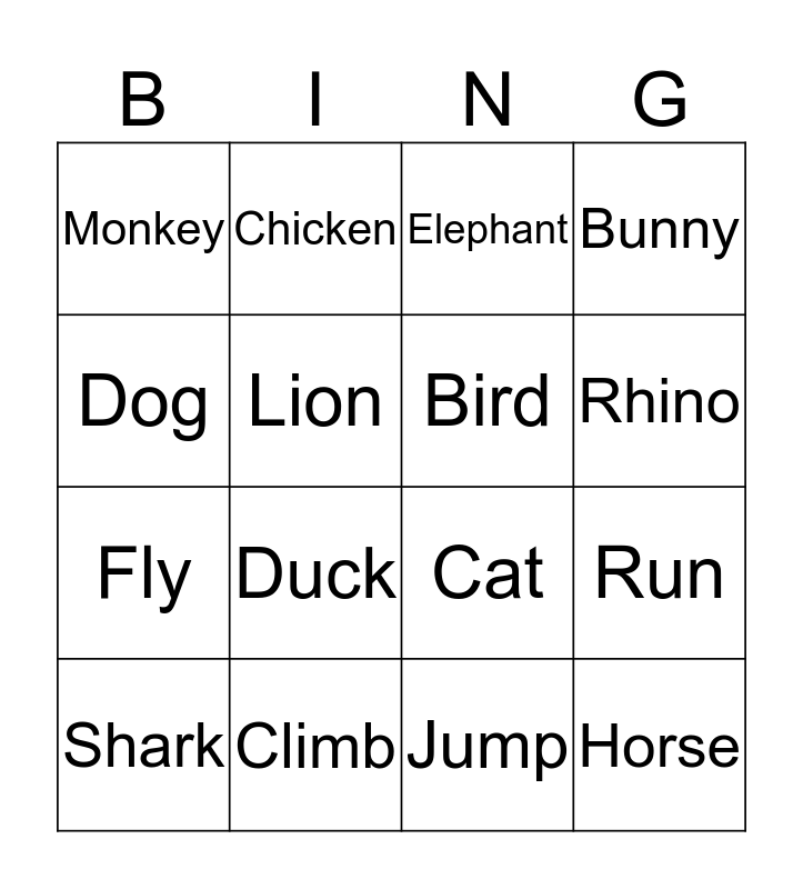This bingo card has 16 words: Shark, Climb, Elephant, Bunny, Dog, Chicken, Cat, Run, Monkey, Lion, Jump, Rhino, Fly, Duck, Bird and Horse.