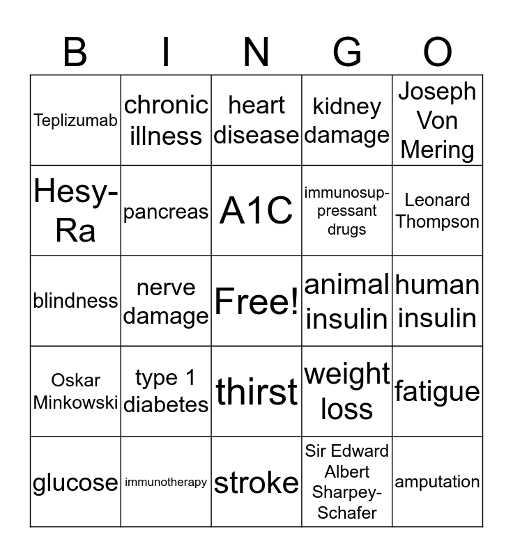 This bingo card has a free space and 24 words: type 1 diabetes, immunotherapy, A1C, glucose, Joseph Von Mering, Teplizumab, Hesy-Ra, chronic illness, animal insulin, thirst, immunosup-pressant drugs, blindness, weight loss, fatigue, pancreas, Sir Edward Albert Sharpey- Schafer, human insulin, heart disease, Leonard Thompson, nerve damage, amputation, Oskar Minkowski, kidney damage and stroke.