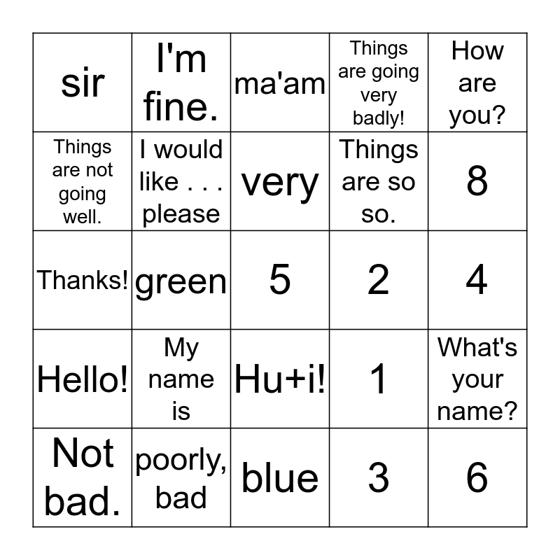 This bingo card has 31 words: blue, red, green, yellow, sir, ma'am, I would like . . . please, 1, 2, 3, 4, 5, 6, 7, 8, 9, What's your name?, My name is, Hello!, Hu+i!, How are you?, I'm doing very well, thanks., Not bad., I'm fine., Things are so so., Things are not going well., Things are going very badly!, Thanks!, poorly, bad, very and And you?.