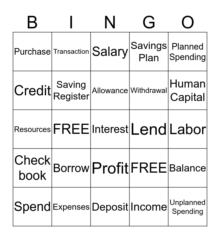This bingo card has 25 words: Borrow, Deposit, Allowance, Spend, Planned Spending, Purchase, Credit, Transaction, Lend, Profit, Withdrawal, Resources, FREE, Balance, Saving Register, Unplanned Spending, Labor, Salary, Human Capital, FREE, Interest, Expenses, Check book, Savings Plan and Income.