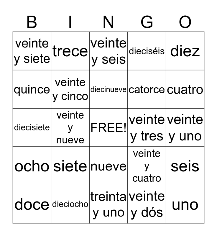 This bingo card has a free space and 31 words: treinta y uno, treinta, veinte y nueve, veinte y ocho, veinte y siete, veinte y seis, veinte y cinco, veinte y cuatro, veinte y tres, veinte y dós, veinte y uno, uno, dós, tres, cuatro, cinco, seis, siete, ocho, nueve, diez, once, doce, trece, catorce, quince, dieciséis, diecisiete, dieciocho, diecinueve and veinte.
