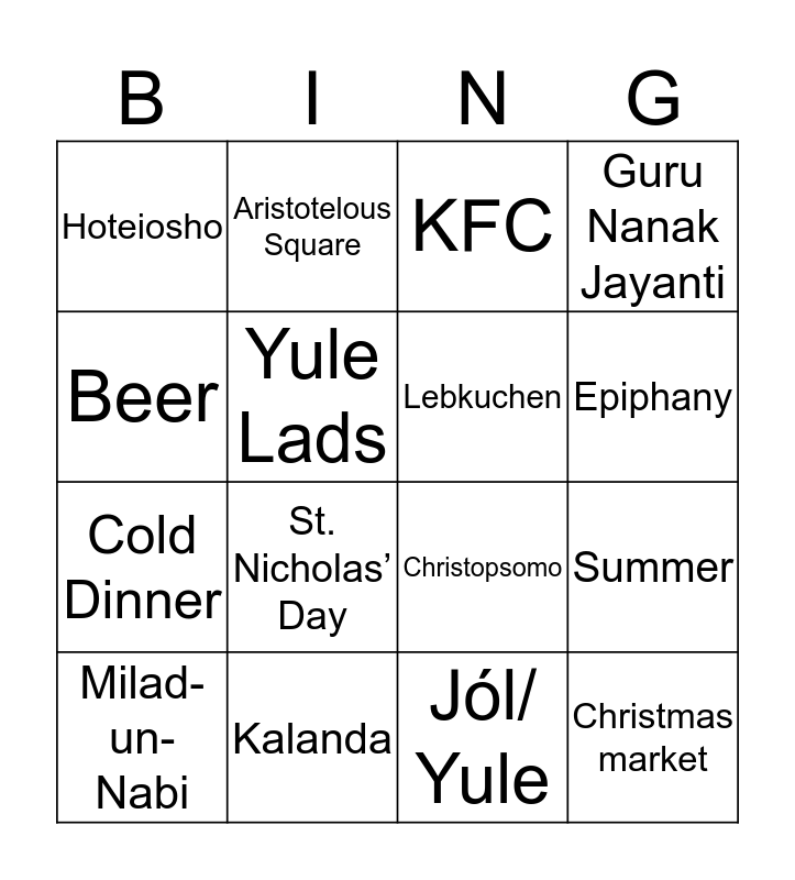 This bingo card has 16 words: Kalanda, Summer, KFC, Hoteiosho, Cold Dinner, Aristotelous Square, Christopsomo, Jól/ Yule, Beer, Yule Lads, Milad-un-Nabi, Guru Nanak Jayanti, St. Nicholas’ Day, Epiphany, Lebkuchen and Christmas market.