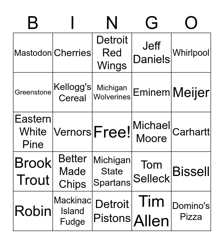 This bingo card has a free space and 49 words: Petoskey Stone, Pasties, Detroit Lions, Tim Allen, Carhartt, White-Tailed Deer, Cherries, Detroit Tigers, Eminem, Chrysler, Greenstone, Vernors, Tom Selleck, Domino's Pizza, Apple Blossom, Coney Dog, Detroit Red Wings, Michael Moore, Herman Miller, Mastodon, Mackinac Island Fudge, Detroit Pistons, Jeff Daniels, Whirlpool, Dwarf Lake Iris, Better Made Chips, Michigan Wolverines, Bob Seger, Bissell, Brook Trout, Faygo, Michigan State Spartans, Diana Ross, La-Z-Boy, Robin, Jiffy Mix, Eastern Michigan Eagles, Serena Williams, Meijer, Painted Turtle, Gerber's Baby Food, Oaklangoogld Golden Grizzlies, Lily Tomlin, General Motors, Eastern White Pine, Kellogg's Cereal, Western Michigan Broncos, Stevie Wonder and Dart Container.