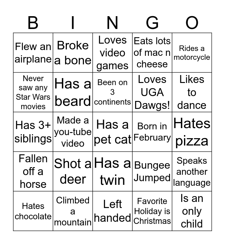 This bingo card has 25 words: Shot a deer, Left handed, Been on 3 continents, Hates chocolate, Rides a motorcycle, Flew an airplane, Never saw any Star Wars movies, Broke a bone, Born in February, Has a twin, Loves UGA Dawgs!, Has 3+ siblings, Bungee Jumped, Speaks another language, Has a beard, Is an only child, Hates pizza, Loves video games, Likes to dance, Made a you-tube video, Has a pet cat, Climbed a mountain, Fallen off a horse, Eats lots of mac n cheese and Favorite Holiday is Christmas.