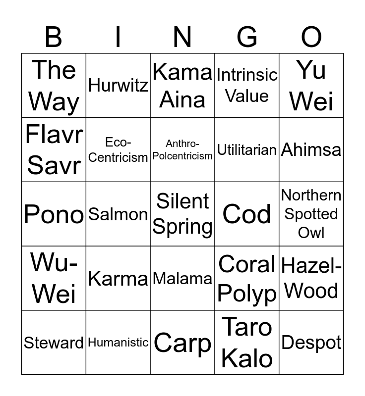 This bingo card has a free space and 24 words: Karma, Humanistic, Anthro-Polcentricism, Steward, Yu Wei, The Way, Flavr Savr, Hurwitz, Cod, Malama, Utilitarian, Pono, Coral Polyp, Hazel-Wood, Eco-Centricism, Taro Kalo, Northern Spotted Owl, Kama Aina, Ahimsa, Salmon, Despot, Wu-Wei, Intrinsic Value and Carp.