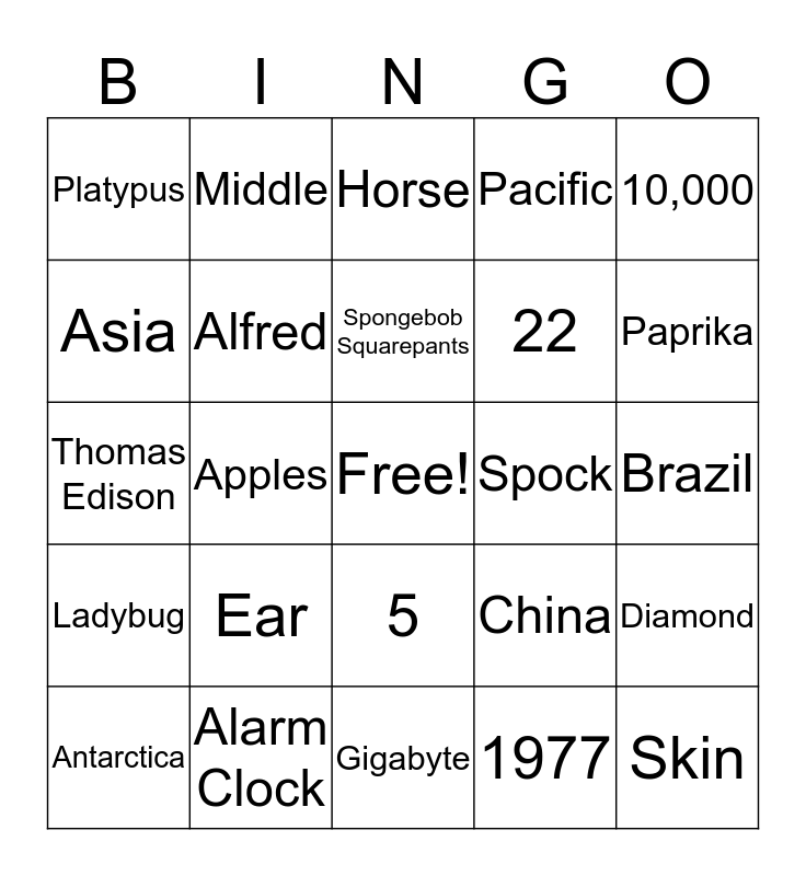 This bingo card has a free space and 24 words: Ear, Alarm Clock, Spongebob Squarepants, Antarctica, 10,000, Platypus, Asia, Middle, Spock, 5, 22, Thomas Edison, China, Diamond, Alfred, 1977, Brazil, Horse, Paprika, Apples, Skin, Ladybug, Pacific and Gigabyte.