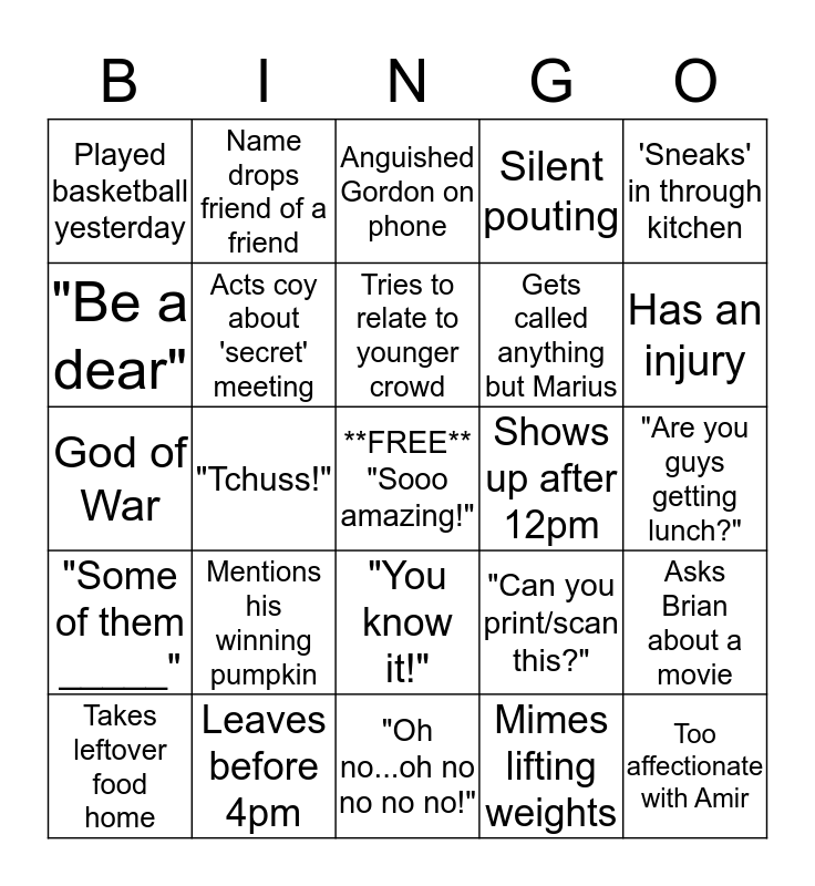 This bingo card has a free space and 29 words: Takes leftover food home, Mentions Timo or Abdullah, "Tchuss!", Random juggling, Played basketball yesterday, Anguished Gordon on phone, Acts coy about 'secret' meeting, Mentions his winning pumpkin, Shows up after 12pm, Leaves before 4pm, "Are you guys getting lunch?", Too affectionate with Amir, "Oh no...oh no no no no!", Mimes lifting weights, Has an injury, Gratuitous, offensive accent, "You know it!", "Some of them _____", 'Sneaks' in through kitchen, God of War, "Can you print/scan this?", Is planning a trip, Gets called anything but Marius, "Be a dear", Silent pouting, Name drops friend of a friend, Asks Brian about a movie, Tries to relate to younger crowd and Is hiding from Dr. K.