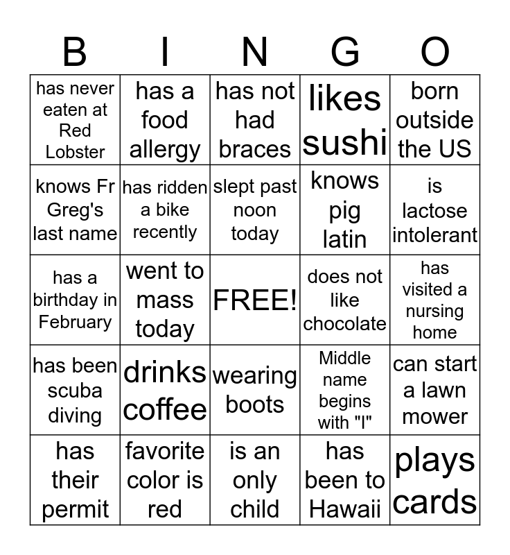 This bingo card has a free space and 33 words: flossed this weekend, has five or more siblings, went to mass today, has been parachuting or parasailing, has been scuba diving, has ridden a bike recently, born outside the US, has their permit, has a food allergy, still believes in Santa, slept past noon today, has not had braces, has read a book for fun, subscribes to a magazine, does not like chocolate, is lactose intolerant, favorite color is red, has a birthday in February, drinks coffee, Middle name begins with "I", wearing boots, wearing contacts, has never eaten at Red Lobster, has visited a nursing home, is an only child, plays cards, likes sushi, knows pig latin, knows Fr Greg's last name, can start a lawn mower, built a snowman last year, has been to Hawaii and can name the 7 dwarfs.