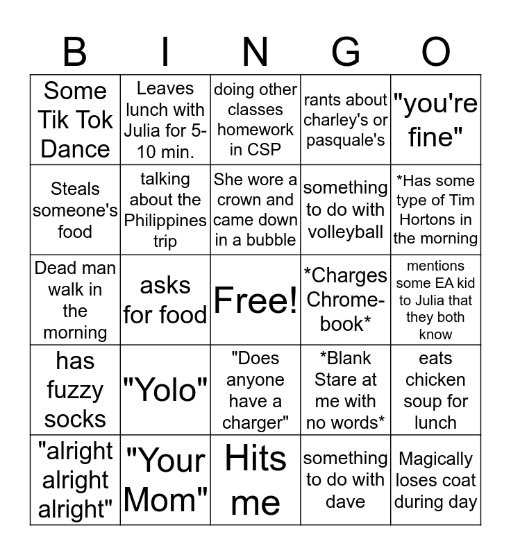 This bingo card has a free space and 24 words: "Yolo", "Your Mom", She wore a crown and came down in a bubble, "alright alright alright", "you're fine", Some Tik Tok Dance, Steals someone's food, Leaves lunch with Julia for 5-10 min., *Charges Chrome-book*, "Does anyone have a charger", something to do with volleyball, Dead man walk in the morning, *Blank Stare at me with no words*, eats chicken soup for lunch, talking about the Philippines trip, something to do with dave, mentions some EA kid to Julia that they both know, doing other classes homework in CSP, *Has some type of Tim Hortons in the morning, asks for food, Magically loses coat during day, has fuzzy socks, rants about charley's or pasquale's and Hits me.